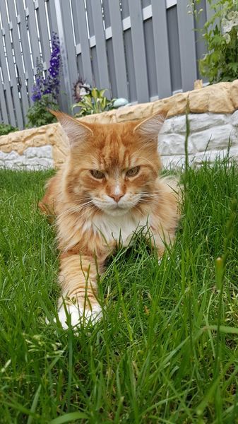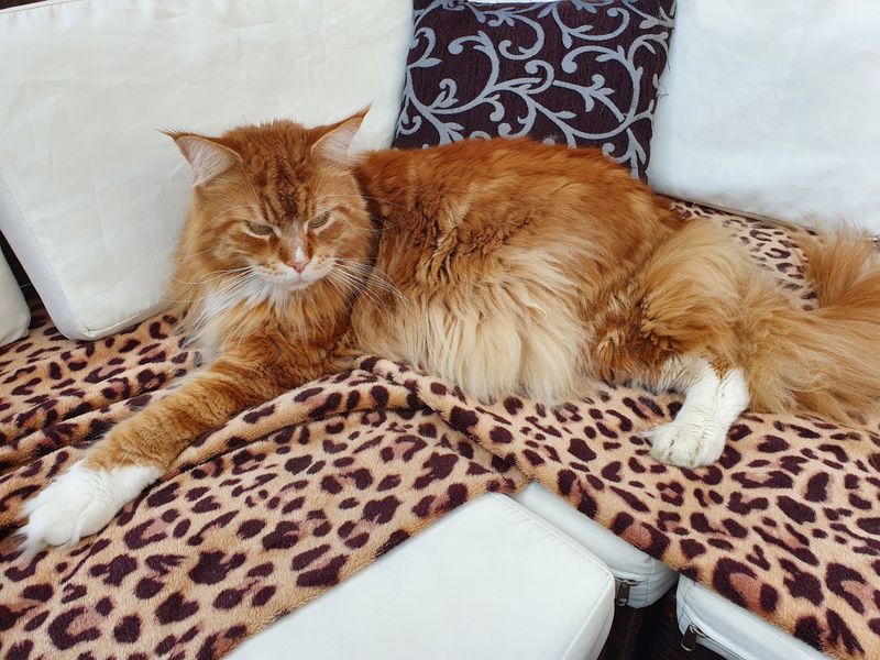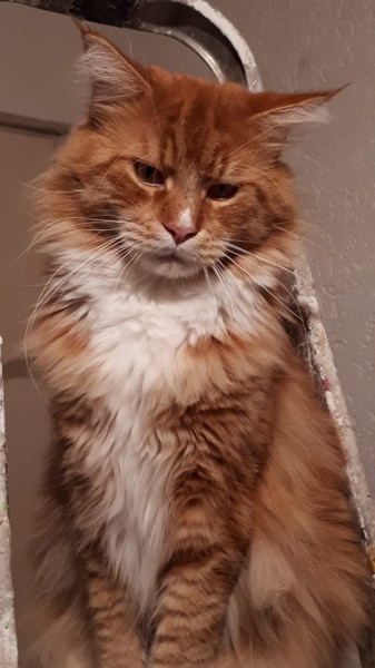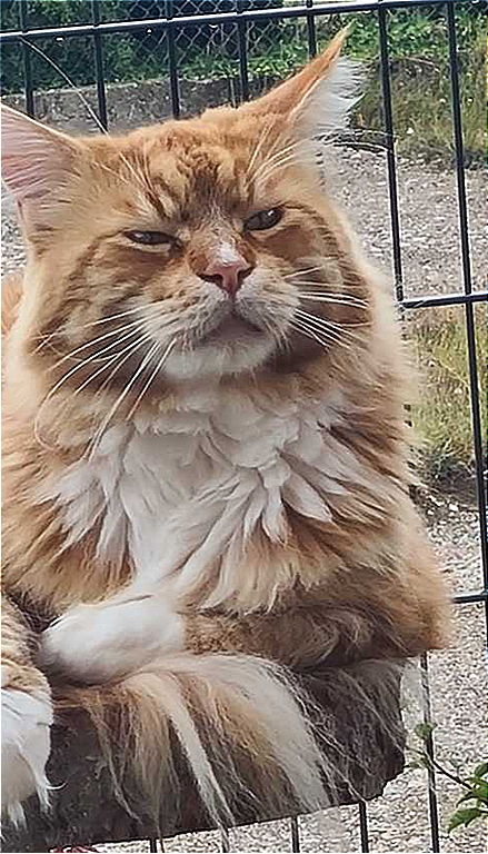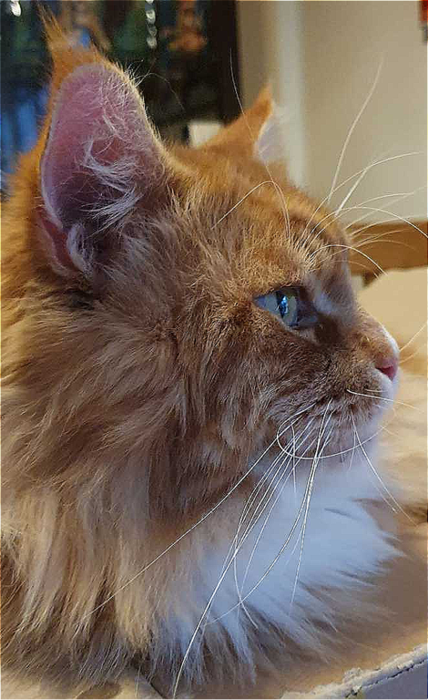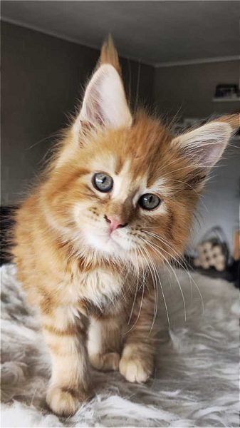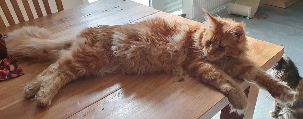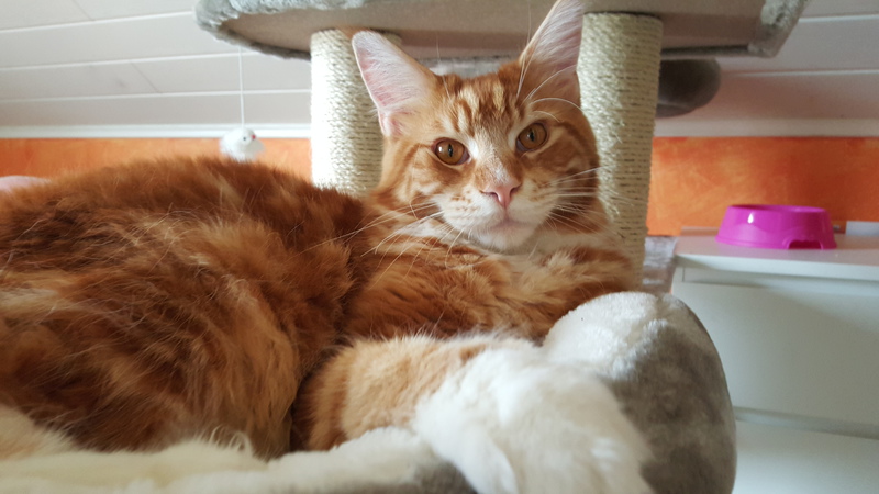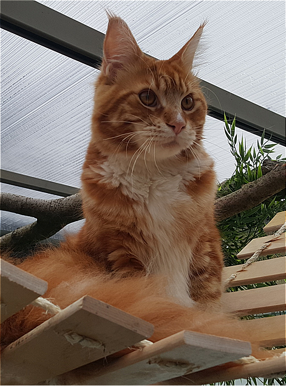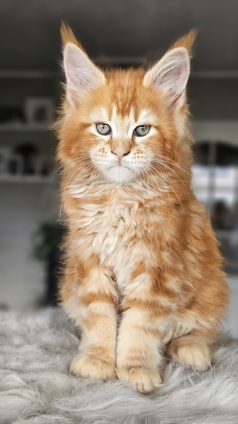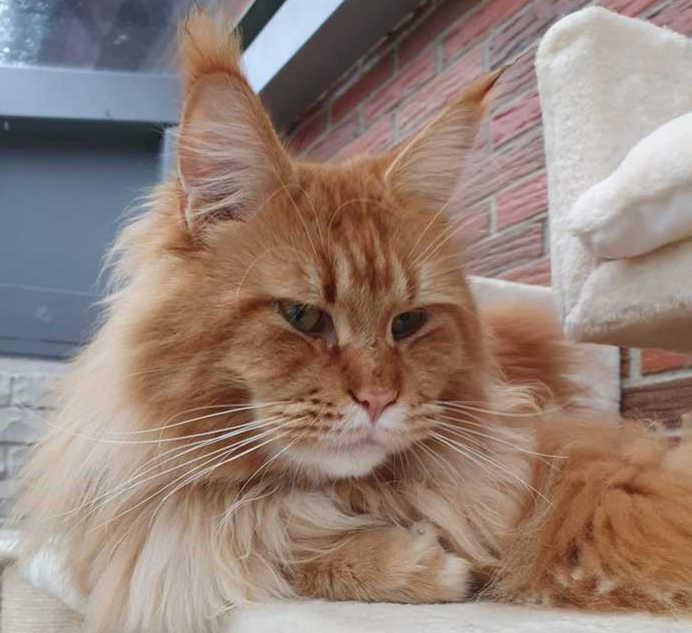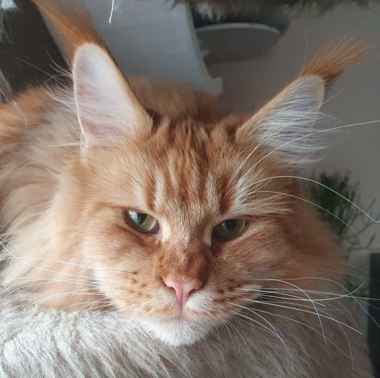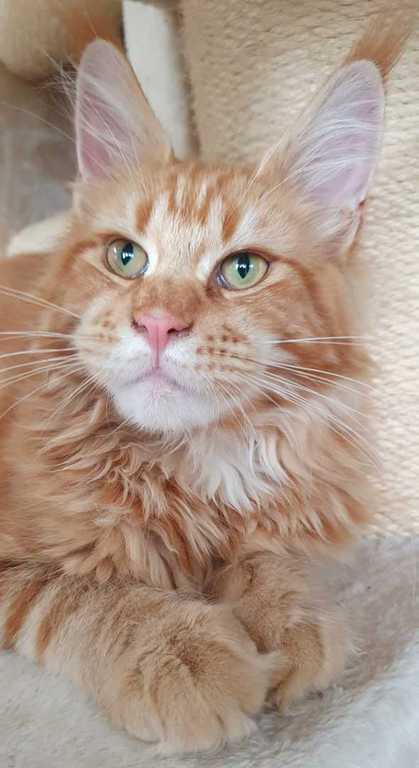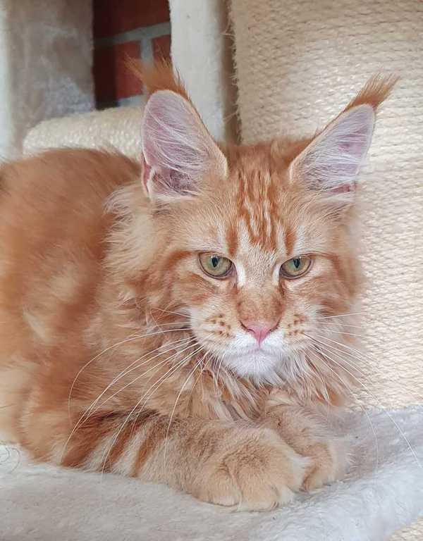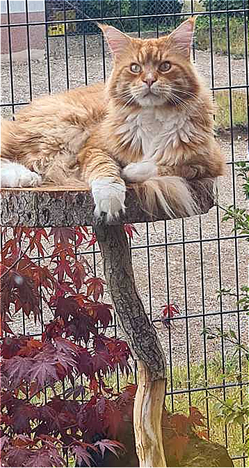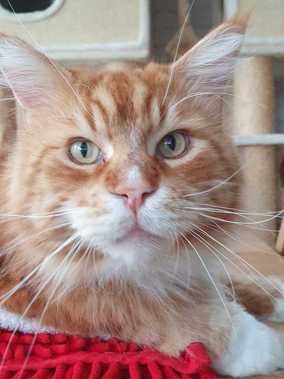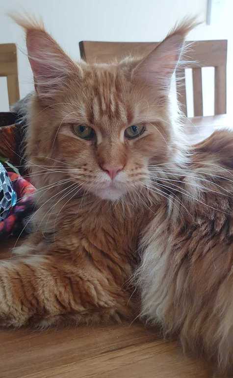Mit 9 Monaten hat er schon eine Risthöhe von 35 cm und eine Gesamtlänge von 1 m . Er ist genauso ,wie wir es lieben. Selbstbewußt, neugierig, liebevoll und Wasserratte. Wir haben 2 Jahre gesucht, um den "Richtigen" zu finden und da ist er ! Vincent ist am 20.01.2024 im Norden von Deutschland, bei den Elblöwen, als red-tabby classic Katerchen geboren. Da ich ein Bauchmensch bin, war die Entscheidung schnell gefallen. Bei Vincent haben wir das absolute Maine coon Wesen und das typische Aussehen gefunden, was wir uns als Papa, für zukünftige Babys vorstellen können. Er ist ein absoluter Schmustetiger, mag das Kämmen und seine Damen, um sich herum. Er ist komplett N/N und neg. auf HCM/RCM geschallt.
