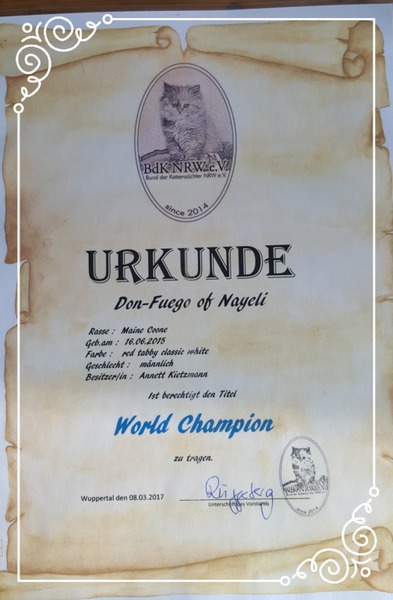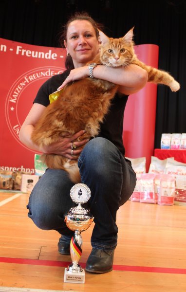 "Worldchampion" erhalten. Ich bin ein wahrer Riese und bringe 12 kg auf die Waage, aber ich leide nicht unter Adipositas, sondern bin stark und habe sehr ausgebildete Muskulatur. Meine Länge beträgt rund 1 m und die Schulterhöhe 35 cm. Durch meine Größe bin ich auch etwas tollpatschig und kann nicht immer so schnell in die Kurvenlage gehen, was meine Besitzer sehr oft zum schmunzeln bringt. Großer Kater, großes Herz. Eine Seele von Kater und ich gebe das an meine Kinder weiter, was mich sehr stolz macht, denn ich kümmere mich, auch als Papa, um meine Kleinen.